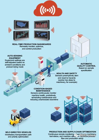 智能工厂利用物联网技术加强信息管理和服务,掌握产销流程、提高生产过程的可控性、减少生产线上人工的干预、及时正确地采集生产线数据,以合理的安排生产计划与生产进度,并优化供应链。传感器应用非常广泛,工业生产各个环节都需要传感器进行监测,并把数据反馈给控制中心,以便对出现异常节点进行及时干预,保证工业生产正常进行。业界普遍认为,新一代的智能传感器是智能工业的心脏,它让产品生产流程持续运行,并让工作人员远离生产线和设备,保证人身安全和健康。