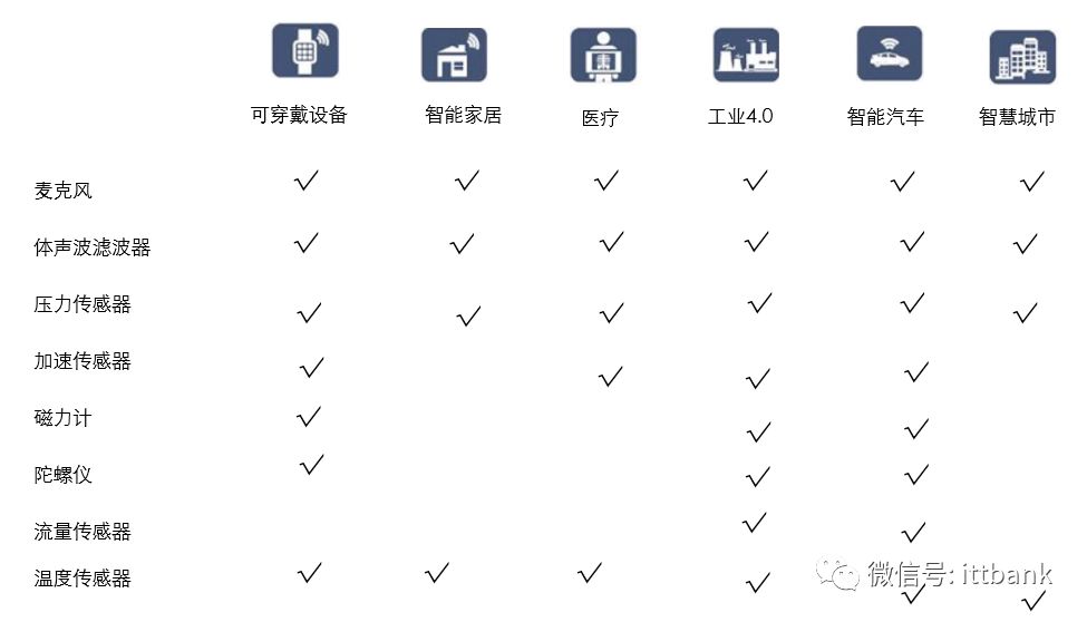 MEMS 技术在可穿戴设备、智能家居、医疗、工业4.0、智能汽车、智慧城市等IOT 细分领域都有广泛的应用,常见的MEMS 传感器诸如麦克风、体声波滤波器、压力传感器、温度传感器等都存在丰富的应用场景。