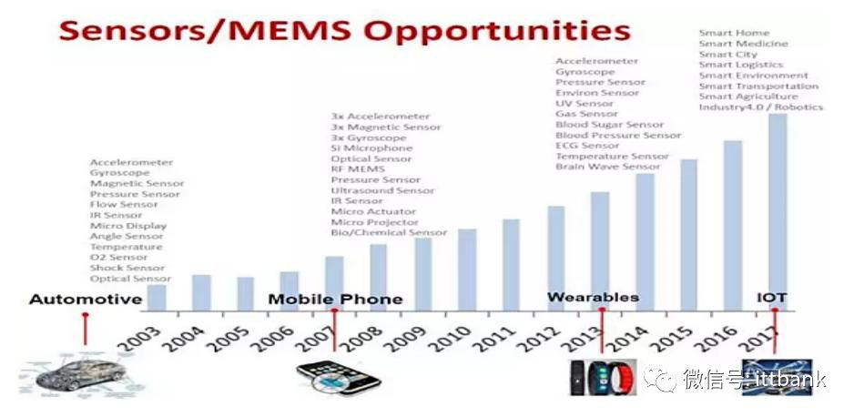 MEMS 的传感器发展共经历了三个阶段,分别对应不同的驱动力。2000 年左右是汽车电子、2007 年左右是智能手机、2013 年左右是可穿戴设备,下一个驱动MEMS 的传感器发展的动力是物联网,业界预测全球传感器需求有望从当前的百亿级激增到2025年的Trillion-Sensor(TSensor,万亿-传感器)量级。