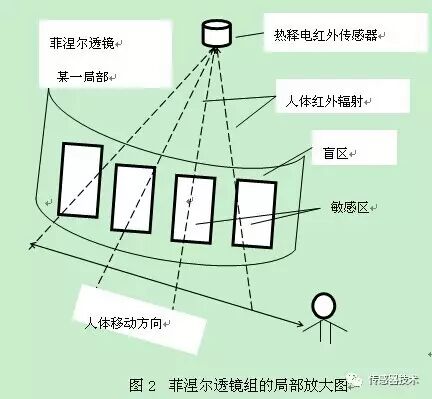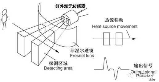 一旦入侵人进入探测区域内,人体红外辐射通过部分镜而聚焦,从而被热释电元接收,但是两片热释电元接收到的热量不同,热释电也不同,不能抵消,经信号处理而报警。