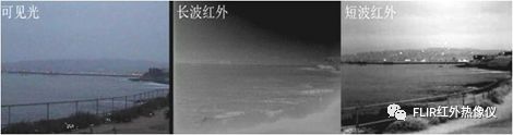 由于处在热交叉点上,海岸与海水的细节在热成像中都丢失了。短波红外能对反射光成像而不是依赖温度差,海岸线图像脱颖而出,同时由于短波红外的透雾能力,相比可见光相机能捕获更多细节。