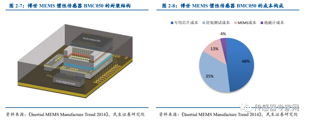 譬如博世MEMS惯性传感器BMC050的成本构成中,专用芯片占比48%,封装测试成本35%,MEMS芯片成本13%。