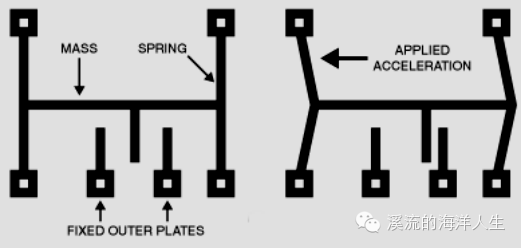 基于各种原因,许多MEMS产品在商业上取得了巨大成功,其中许多器件已经获得广泛应用。汽车工业是MEMS技术的主要驱动力之一。例如MEMS振动结构陀螺仪,是一款新的相当便宜的设备,目前用于汽车防滑或电子稳定控制系统中。村田电子的SCX系列MEMS加速度计、陀螺仪和倾斜仪,以及将这些功能集成在一个单芯片中可助力特定的汽车应用---因为它们的精度要求可能会非常高。基于MEMS的气囊传感器自上世纪90年代起在几乎所有汽车中已经普遍取代了机械式碰撞传感器。上图显示了一个简化的MEMS加速度计示例,同碰撞传感器中使用的类似。一个带有一定质量块的悬臂梁连接到一个或多个固定点以作为弹簧。当传感器沿梁的轴线加速时,该梁会移动一段距离,这段距离可以通过梁的牙齿与外部固定导体之间的电容变化来测量。