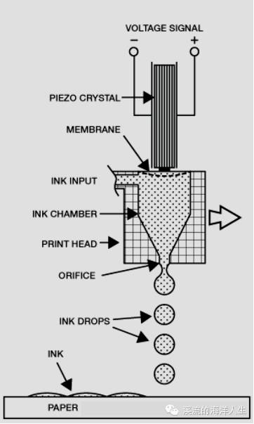 许多商用和工业用喷墨打印机使用基于MEMS技术的打印机喷头,保持这些墨滴并在需要时精确地放下这些墨滴——这一技术被称为按需投放(DoD)。墨滴放置在横跨压电材料(比如lead zirconatetitanate,)组成的元件中,通过施加的电压来进行挤压。这增加了打印头墨水室的压力,通过施力形成一个非常小量(相对压缩)的墨水,并从喷嘴中喷出。