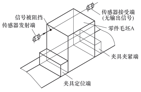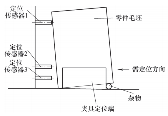 毛坯在预定位过程中,其中两个维度的定位可以由夹具来保证,在剩余的一个维度,毛坯可以自由活动,为了保证其位置的正确性以及每个毛坯定位的一致性,需在该方向设置定位传感器(见图1)。