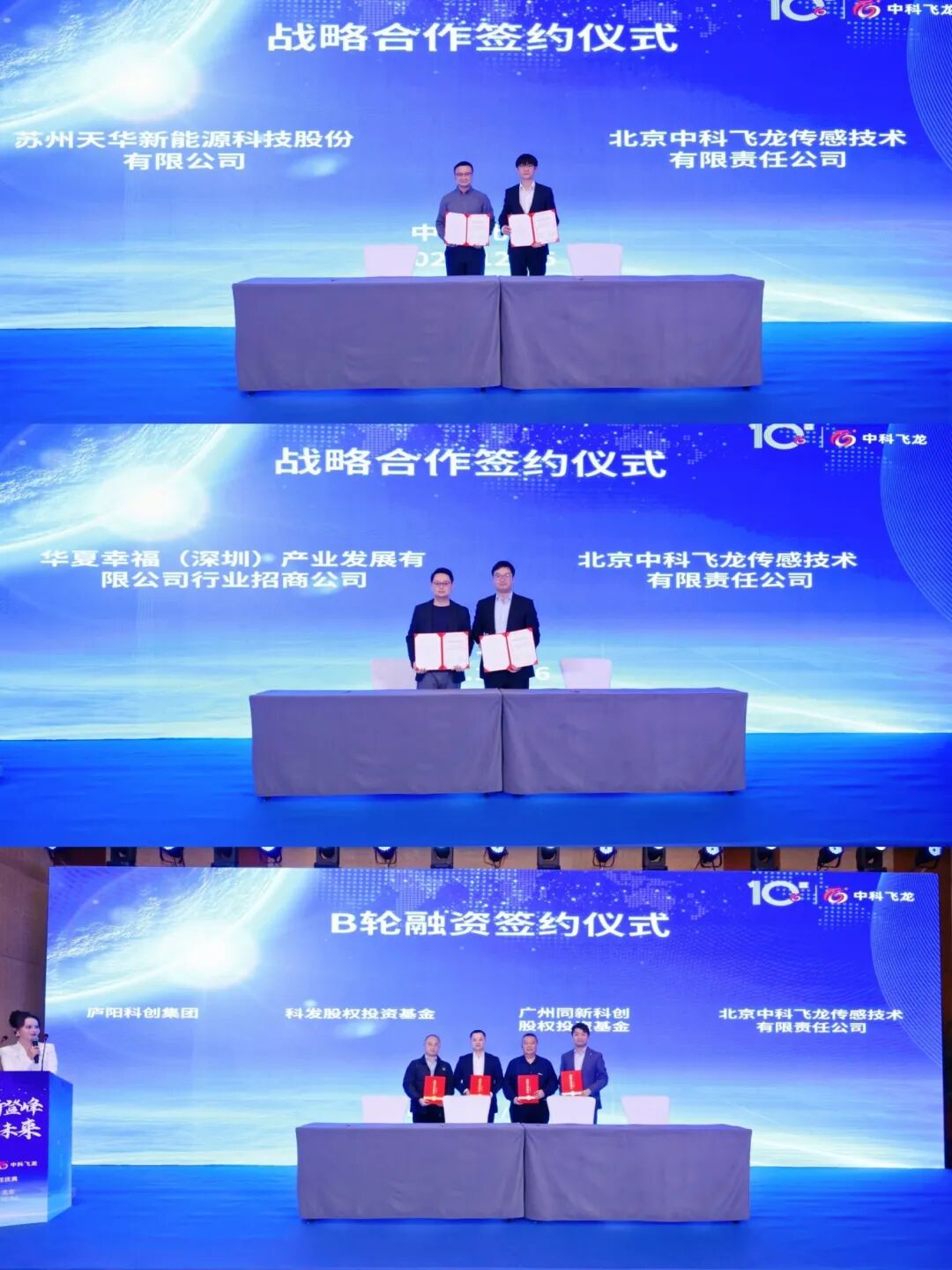 领导致辞后,在现场嘉宾的共同见证下,中科飞龙与苏州天华新能源科技股份有限公司、华夏幸福(深圳)产业发展有限公司签署了战略合作协议。紧接着,公司与庐阳科创集团、科发股权投资基金、广州同新科创股权投资基金进行了B轮融资签约。这一系列重要签约,标志着中科飞龙在产业协同和资本助力下,迈入了规模化、高速发展的新阶段。